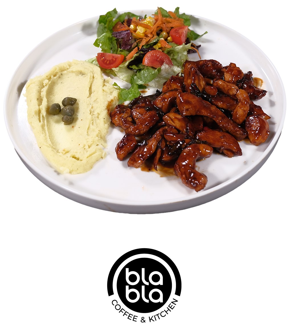 (Bazlama ekmeği arasında domates soslu jülyen tavuk dilimleri,renkli biberler, mantar, bazlama ekmeği üzerinde beşamel sos ve rende kaşar peyniri, patates cips, dip sos ve maskolin salata ile servis edilir. )
